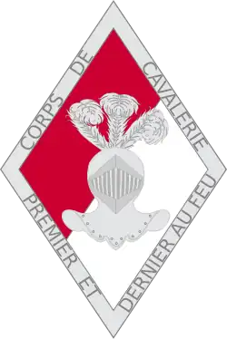 Le corps de cavalerie adopte un insigne en forme de losange, taillé rouge et blanc (couleurs du fanion d'un commandant de groupe de divisions de cavalerie), chargé d'un heaume empanaché. Le losange est bordé du nom de l'unité (Corps de cavalerie) et de sa devise Premier et dernier au feu[11].