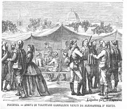 Le 20 mai, le recrutement des troupes commence très lentement. Virgilio Estival, lieutenant d'origine française de la 12e compagnie de le 2e régiment de volontaires italiens écrit : « Toutes les provinces italiennes donnèrent leur quota, mais celles qui se distinguèrent le plus furent la Vénétie et Rome. La Vénétie, qui avait donné beaucoup de ses fils à l'armée régulière, donna plus de 12 000 volontaires à Garibaldi, et je me souviens avec une grande satisfaction que plus des deux tiers des hommes qui formaient la compagnie dont j'avais en charge l'organisation appartenaient aux provinces soumises à l'Autriche[…] On entendait dire que ces hommes se sacrifiaient pour le droit de retourner libres dans leur pays, pour reconquérir le foyer domestique, pour embrasser librement leur famille. Certains régiments qui s'étaient formés dans les provinces méridionales étaient presque exclusivement composés de Romagnoles, qui à mon avis, formaient la population la plus énergique d'Italie. En général, toutes les provinces firent son devoir. Florence donna près de 4 000 volontaires, Turin plus de 3000, Parme plus de 1000, Ferrare, qui n'a que 25 000 habitants, en donna 1 000. Lugo, qui en a seulement 9 000, en a donné 500, Faenza, 300. En quatre jours, Bologne eut 1 500 inscrits, Gênes, 600, Ancône, 450. [...] « C'est une levée en masse », dit le général Pettinengo « Ce n'est pas ce que nous voulons » »[2].