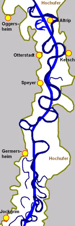 Après la fin de la dernière période glaciaire, le Rhin supérieur avait commencé à creuser dans ses alluvions et avait formé des rives escarpées sur lesquelles des agglomérations pouvaient se développer à l'abri des inondations. Cependant les villes ou villages situés au niveau du fleuve étaient sujets à de fortes inondations[1]. Le cours du Rhin entre Bâle et Karlsruhe se cantonnait dans une vallée de deux à trois kilomètres de large avec beaucoup de bras de rivière et de petites îles; plus en aval, entre Karlsruhe et Mayence, son cours formait des méandres particulièrement prononcés et tortueux dans une zone de terrain plat beaucoup plus large.