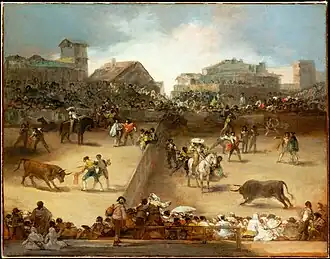 Cette toile est à rapprocher d'une autre œuvre taurine, plus petite : Corrida dans un village peinte sur bois en 1814[6].. Elles ont le même style . Dans les deux tableaux, le peintre reproduit le mouvement de la même façon. Dans l'arène divisée, le picador attend la charge du taureau d'un côté, de l'autre deux toreros se préparent à donner la mort. Dans la corrida dans un village, tout est concentré sur le picador. « Mais il y a en commun cette foule, ces toreros de fortune, ces picadors qui ne sont certainement pas professionnels et qui, à l'occasion pourraient former un groupe de guérilleros irréguliers, caractéristiques de la lutte dans toute l'Espagne d'alors[7]. »