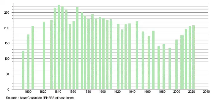 L'évolution du nombre d'habitants est connue à travers les recensements de la population effectués dans la commune depuis 1793. Pour les communes de moins de 10 000 habitants, une enquête de recensement portant sur toute la population est réalisée tous les cinq ans, les populations de référence des années intermédiaires étant quant à elles estimées par interpolation ou extrapolation[42]. Pour la commune, le premier recensement exhaustif entrant dans le cadre du nouveau dispositif a été réalisé en 2007[43].