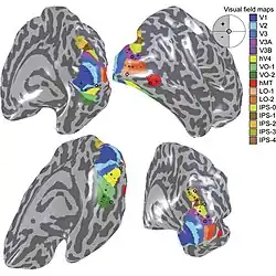 Grâce à la méthode de l'onde mobile, une quinzaine d'aires visuelles rétinotopiques[3], ont été caractérisées chez l'homme. Toutes les études s'accordent sur la localisation et les propriétés des aires visuelles V1, V2, V3 et V3A. Au-delà, pour les aires visuelles de plus haut niveau, certains désaccords entre les équipes ne sont pas encore complètement résolus[14].