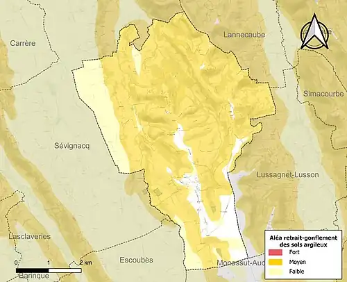 Le retrait-gonflement des sols argileux est susceptible d'engendrer des dommages importants aux bâtiments en cas d’alternance de périodes de sécheresse et de pluie[27]. 78,8 % de la superficie communale est en aléa moyen ou fort (59 % au niveau départemental et 48,5 % au niveau national)[Carte 3]. Depuis le , en application de la loi ELAN, différentes contraintes s'imposent aux vendeurs, maîtres d'ouvrages ou constructeurs de biens situés dans une zone classée en aléa moyen ou fort[Note 4],[28].