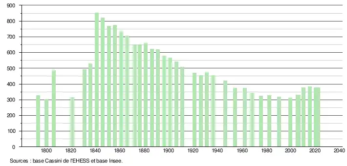 L'évolution du nombre d'habitants est connue à travers les recensements de la population effectués dans la commune depuis 1793. Pour les communes de moins de 10 000 habitants, une enquête de recensement portant sur toute la population est réalisée tous les cinq ans, les populations de référence des années intermédiaires étant quant à elles estimées par interpolation ou extrapolation[35]. Pour la commune, le premier recensement exhaustif entrant dans le cadre du nouveau dispositif a été réalisé en 2005[36].