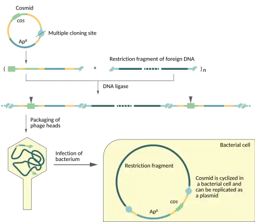Contrairement aux plasmides, ils peuvent également être encapsidés in vitro dans des capsides de phage, une étape qui nécessite des extrémités cohésives, également connues sous le nom de sites cos, également utilisées dans le clonage avec un phage lambda comme vecteur, cependant dans ce cas presque tous les gènes lambda ont été supprimés à l'exception de la séquence cos. L'ADN cosmide hybride des capsides peut alors être transféré dans les cellules bactériennes par transduction. Comme il existe une exigence d'empaquetage in vitro selon laquelle au moins 38 kb d'ADN sont nécessaires entre les sites cos, le vecteur sans ADN inséré ne sera pas encapsidé. L'instabilité des plasmides est accrue si le nouvel ADN inséré contient de nombreuses répétitions directes ou de l'ADN palindromique (répétitions inversées). La taille d'ADN insérée dans des plasmides est donc limitée car une grande taille augmente la probabilité d'une recombinaison. Les extrémités cohésives correspondant aux sites cos permettent de résoudre ce problème et d'augmenter la capacité du plasmide. L'instabilité des plasmides peut être largement contrée par l'utilisation d'une bactérie hôte présentant des mutations spécifiques affectant la recombinaison de l'ADN[2],[4].