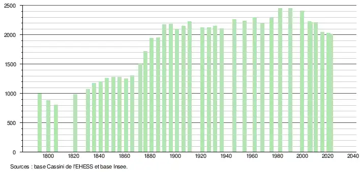 L'évolution du nombre d'habitants est connue à travers les recensements de la population effectués dans la commune depuis 1793. Pour les communes de moins de 10 000 habitants, une enquête de recensement portant sur toute la population est réalisée tous les cinq ans, les populations de référence des années intermédiaires étant quant à elles estimées par interpolation ou extrapolation[23]. Pour la commune, le premier recensement exhaustif entrant dans le cadre du nouveau dispositif a été réalisé en 2005[24].