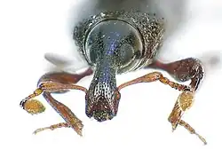 Ce charançon mesure de 4 à 6 millimètres de longueur avec un corps très plat et allongé. Il est glabre et d'un noir brunâtre brillant. Ses élytres sont marron foncé. Ses pattes sont rouge foncé. Sa petite tête est prolongée d'un rostre au large épistome avec deux petites antennes courtes et coudées. Son pronotum est presque rectangulaire vu d'en haut et légèrement plus étroit que les élytres.