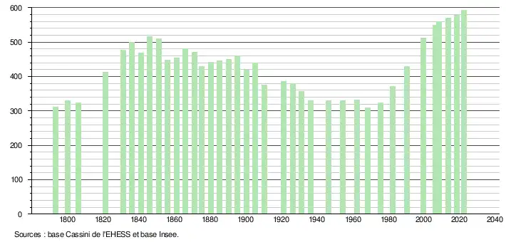 L'évolution du nombre d'habitants est connue à travers les recensements de la population effectués dans la commune depuis 1793. Pour les communes de moins de 10 000 habitants, une enquête de recensement portant sur toute la population est réalisée tous les cinq ans, les populations de référence des années intermédiaires étant quant à elles estimées par interpolation ou extrapolation[18]. Pour la commune, le premier recensement exhaustif entrant dans le cadre du nouveau dispositif a été réalisé en 2008[19].