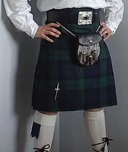 Le costume traditionnel masculin comprend un kilt (ou, s'il s'agit d'un pantalon en tartan, de trews). Le sporran, porté à la ceinture, est une sacoche de petite taille qui supplée à l'absence de poches dans le kilt. Les chaussures traditionnelles sont les ghillies, des chaussures de cuir souple et épais, lacées au-dessus de la cheville. Le sgian dubh est un petit poignard, à l'origine fabriqué à partir de la pointe d'une épée brisée, qui est porté dans la chaussette droite. Lors d'occasions formelles, une courte veste noire, sur le modèle du spencer, est portée, sur une chemise blanche et un gilet noir.