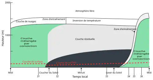 • Vers le coucher du soleil, la turbulence se dissipe et la couche mélangée, au-dessus de la couche de surface, se transforme en une couche résiduelle dont l’état moyen initial est celui de la couche mélangée avec stratification quasi neutre[11].