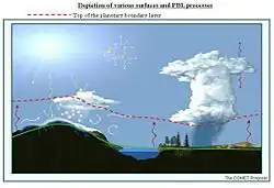 • Le réchauffement diurne se passant près du sol, la couche limite planétaire forme un « bouchon » qu'il faut vaincre pour générer des nuages convectifs de la famille des cumulus (cumulus, cumulus congestus et cumulonimbus). En effet, le sommet de la couche limite est le plus souvent associé avec le niveau de condensation par ascension (NCA) et la base des nuages. Le niveau de convection libre (NCL), qui détermine le début de la convection et l'extension verticale d'un nuage convectif, peut cependant être légèrement plus élevé (voir : Détermination de la base des cumulus)[8],[10]. La coïncidence entre la base des nuages et le sommet de la CLA est cependant tributaire d'une masse d'air normalement humide, dans une région plus aride, les nuages pourrait se former à plus haute altitude que la CLA (le NCA étant difficile à atteindre) ;