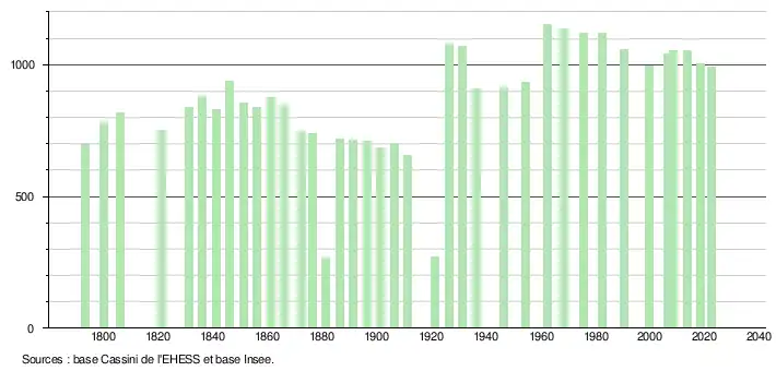 L'évolution du nombre d'habitants est connue à travers les recensements de la population effectués dans la commune depuis 1793. Pour les communes de moins de 10 000 habitants, une enquête de recensement portant sur toute la population est réalisée tous les cinq ans, les populations de référence des années intermédiaires étant quant à elles estimées par interpolation ou extrapolation[33]. Pour la commune, le premier recensement exhaustif entrant dans le cadre du nouveau dispositif a été réalisé en 2008[34].