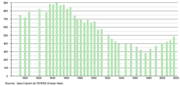 L'évolution du nombre d'habitants est connue à travers les recensements de la population effectués dans la commune depuis 1793. Pour les communes de moins de 10 000 habitants, une enquête de recensement portant sur toute la population est réalisée tous les cinq ans, les populations de référence des années intermédiaires étant quant à elles estimées par interpolation ou extrapolation[2]. Pour la commune, le premier recensement exhaustif entrant dans le cadre du nouveau dispositif a été réalisé en 2006[3].