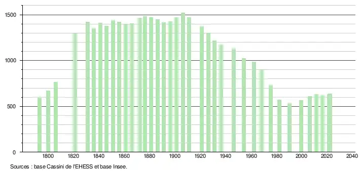 L'évolution du nombre d'habitants est connue à travers les recensements de la population effectués dans la commune depuis 1793. Pour les communes de moins de 10 000 habitants, une enquête de recensement portant sur toute la population est réalisée tous les cinq ans, les populations de référence des années intermédiaires étant quant à elles estimées par interpolation ou extrapolation[19]. Pour la commune, le premier recensement exhaustif entrant dans le cadre du nouveau dispositif a été réalisé en 2006[20].
