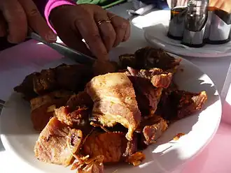 Plat de "chicharrón" (Espagne, Mexique, Amérique du Sud) avec de la couenne de porc frite.