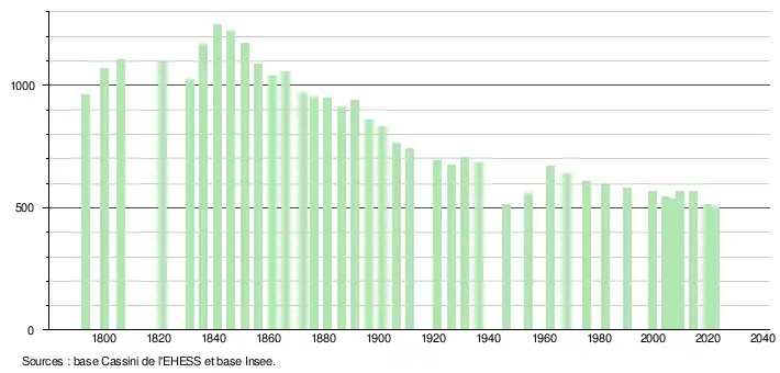 L'évolution du nombre d'habitants est connue à travers les recensements de la population effectués dans la commune depuis 1793. Pour les communes de moins de 10 000 habitants, une enquête de recensement portant sur toute la population est réalisée tous les cinq ans, les populations de référence des années intermédiaires étant quant à elles estimées par interpolation ou extrapolation[16]. Pour la commune, le premier recensement exhaustif entrant dans le cadre du nouveau dispositif a été réalisé en 2004[17].