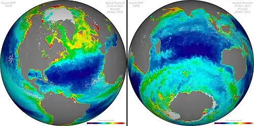 Les instruments de mesure de type radiomètre embarqués à bord de satellites d'observation de la Terre sont particulièrement bien adaptés pour collecter à l'échelle de la planète la couleur des océans. Le premier instrument destiné à effectuer ce type de mesure était CZCS embarqué à bord du satellite météorologique Nimbus 7 de la NASA qui a été placé en orbite en 1979. Depuis cette date de nombreux instruments ont été lancés dans l'espace et permettent d'effectuer des mesures avec une périodicité quotidienne[2].