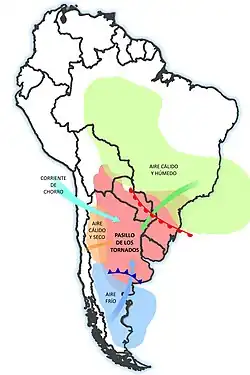 Selon les études, le couloir tornadique serait le second en importance au monde après les États-Unis[5]. Les analyses climatiques et météorologiques, ont identifié une possible « zone rouge » de tornades dans la région :