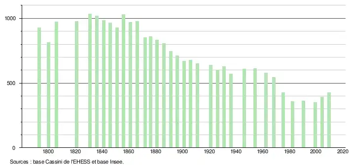- ↑ Dans le tableau des recensements et le graphique, par convention dans Wikipédia, le principe a été retenu, pour les populations légales postérieures à 1999 de n’afficher dans le tableau des recensements et le graphique que les populations correspondant à l'année 2006, première population légale publiée calculée conformément aux concepts définis dans le décret no 2003-485 du 5 juin 2003, et les années correspondant à une enquête exhaustive de recensement pour les communes de moins de 10 000 habitants, ainsi que la dernière population légale publiée par l’Insee.