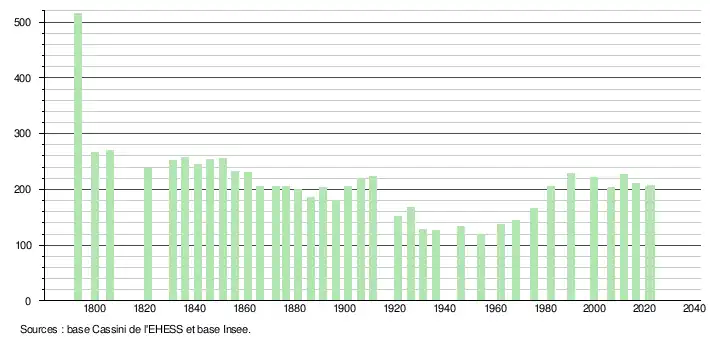 L'évolution du nombre d'habitants est connue à travers les recensements de la population effectués dans la commune depuis 1793. Pour les communes de moins de 10 000 habitants, une enquête de recensement portant sur toute la population est réalisée tous les cinq ans, les populations de référence des années intermédiaires étant quant à elles estimées par interpolation ou extrapolation[19]. Pour la commune, le premier recensement exhaustif entrant dans le cadre du nouveau dispositif a été réalisé en 2006[20].