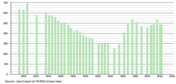 L'évolution du nombre d'habitants est connue à travers les recensements de la population effectués dans la commune depuis 1793. Pour les communes de moins de 10 000 habitants, une enquête de recensement portant sur toute la population est réalisée tous les cinq ans, les populations de référence des années intermédiaires étant quant à elles estimées par interpolation ou extrapolation[22]. Pour la commune, le premier recensement exhaustif entrant dans le cadre du nouveau dispositif a été réalisé en 2005[23].
