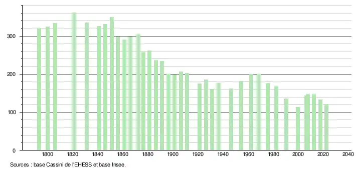 L'évolution du nombre d'habitants est connue à travers les recensements de la population effectués dans la commune depuis 1793. Pour les communes de moins de 10 000 habitants, une enquête de recensement portant sur toute la population est réalisée tous les cinq ans, les populations de référence des années intermédiaires étant quant à elles estimées par interpolation ou extrapolation[25]. Pour la commune, le premier recensement exhaustif entrant dans le cadre du nouveau dispositif a été réalisé en 2007[26].