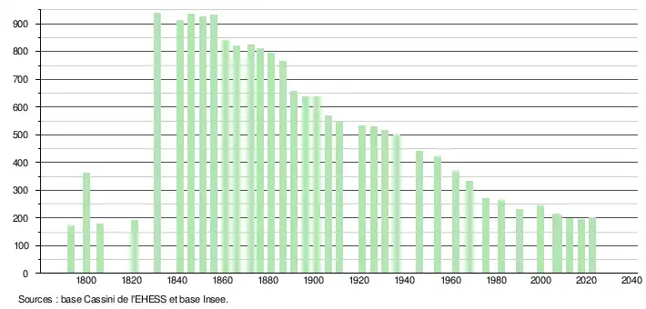 L'évolution du nombre d'habitants est connue à travers les recensements de la population effectués dans la commune depuis 1793. Pour les communes de moins de 10 000 habitants, une enquête de recensement portant sur toute la population est réalisée tous les cinq ans, les populations de référence des années intermédiaires étant quant à elles estimées par interpolation ou extrapolation[22]. Pour la commune, le premier recensement exhaustif entrant dans le cadre du nouveau dispositif a été réalisé en 2007[23].