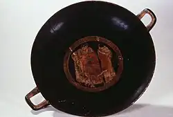 À l'intérieur le médaillon central illustre une scène de séduction pédérastique, rite de passage dans la Grèce antique au cours duquel un adulte transmet à un éphèbe plus jeune les valeurs citoyennes et aristocratiques. Deux personnages se font face : l'éraste dont l'himation est ouvert en signe de séduction et l'éromène, plus petit et enveloppé dans son vêtement[4].