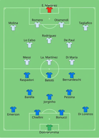 L'Italie domine le début de la rencontre mais, à la 27e minute, l'arrière latéral argentin Nicolás Tagliafico presse et récupère dans son camp le ballon pour le transmettre à Lionel Messi. Messi passe à Lautaro Martínez qui ouvre le score. L'Argentine creuse l'écart avant la mi-temps dans temps additionnel. Lautaro Martínez se défait des défenseurs centraux italiens puis donne le ballon à droite pour Ángel Di María qui trompe le gardien Gianluigi Donnarumma.