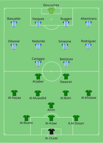 | Al-Otaibi - A. Al-Dosari, Al-Roomi, Al-Alawi, Amin - Al-Bishi, Owairan, Al-Jaber ( | Équipes | Meola - Clavijo, Balboa, Lapper, Harkes | |||