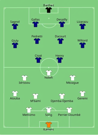 En mémoire de Marc-Vivien Foé, disparu trois jours plus tôt, les deux équipes arrivent sur la pelouse en lui rendant hommage. L'équipe du Cameroun fait preuve d'une formidable volonté pour lui faire honneur. Les Africains sont en jambes et perturbent l'équipe de France. Les attaquants français se démènent face à la meilleure défense de la compétition, toujours invaincue à l'entame de ce cinquième match. Les deux gardiens, Kameni et Barthez, se font remarquer par leurs arrêts durant toute la rencontre. Après l'heure de jeu, Eto'o entre en jeu et affole la défense bleue. En prolongation, pour la quatrième fois en cinq ans, les Tricolores forcent la décision grâce à un but en or d'Henry[4].