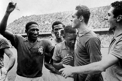 La sixième édition de la Coupe du monde, en 1958, se déroule en Suède. L'équipe d'URSS fait son apparition dans la compétition. L'édition est marquée par l'échec de l'Italie à se qualifier pour la phase finale de la compétition. Inattendue, l'équipe de France étonne par son jeu offensif[34]. La progression des joueurs français est arrêtée en demi-finale par le Brésil sur le score de 5-2 grâce à un triplé du jeune Pelé[34]. Dans l'autre demi-finale, la Suède, à domicile, se qualifie pour la finale en battant la RFA. En finale de la compétition, le Brésil l'emporte logiquement 5-2 avec deux nouveaux buts de Pelé et deux autres de Vavá[35]. Avec 13 buts, Just Fontaine est sans conteste le meilleur buteur de la compétition bien aidé par sa complicité avec le meneur de jeu français Raymond Kopa ; ils permettent à la France de se hisser pour la première fois sur le podium en remportant la 3e place face à la RFA, champion du monde sortant.