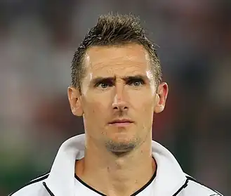 L'Allemand Miroslav Klose détient le record de buts marqués en Coupe du monde avec 16 buts, suivi du Brésilien Ronaldo (15 buts) et de l'Allemand Gerd Müller qui en compte 14[78]. Le Français Just Fontaine reste le meilleur buteur sur une seule édition avec 13 buts en 1958. Il n'a pas marqué lors d'une autre édition. Lionel Messi est quatrième ex-aequo avec 13 buts. Pelé et le Français Mbappé sont les sixièmes meilleurs buteurs de l'histoire de la Coupe du monde ex-aequo avec 12 buts. Avec quatre buts en finale, Mbappé (2018, 2022) est le meilleur buteur en finale. Le Français et l'anglais Hurst sont les seuls joueurs de l'histoire à avoir inscrit un triplé en finale. Le Russe Oleg Salenko reste le meilleur buteur en un seul match de Coupe du monde avec cinq buts lors du match Russie-Cameroun gagné par la Russie 6-1 en 1994[79]. Lors de ce match, un autre record a été battu par Roger Milla. Il devient le plus vieux buteur de la compétition à 42 ans et 39 jours[80],[59], il est également le joueur de champ le plus âgé lors d'une phase finale[81]. En 2018, le gardien égyptien Essam el-Hadari devient le joueur le plus âgé à participer à une Coupe du monde, à l'âge de 45 ans et 161 jours. Le plus jeune est le Nord-Irlandais Norman Whiteside, âgé de 17 ans et 41 jours lors du premier match disputé contre la Yougoslavie en 1982[80].