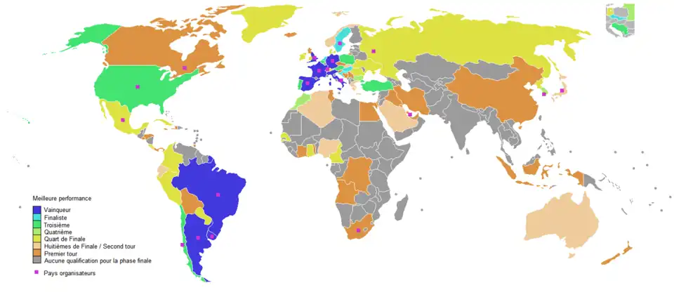 Cinq nations ont organisé à deux reprises la Coupe du monde : l'Italie, la France, le Mexique, l'Allemagne et le Brésil. À l'exception du Brésil et du Mexique, chacune a remporté une fois la Coupe du monde sur son propre sol. Contrairement au Mexique, deux fois éliminé en quart de finale à domicile, le Brésil a atteint autant de fois le dernier carré sur son propre sol (vice-champion en 1950). Cinq champions sortants ont été éliminés au premier tour (le Brésil en 1966, la France en 2002, l'Italie en 2010, l'Espagne en 2014 et l'Allemagne en 2018).