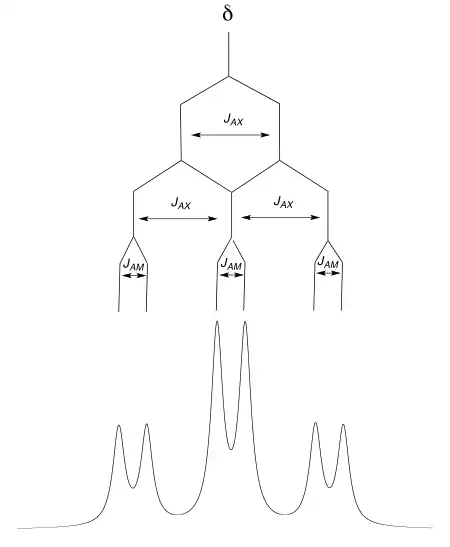 On peut traiter de la même façon un système de spins AMX2 dans lequel un spin A est couplé à un spin M (avec une constante de couplage JAM) et à deux spins X magnétiquement équivalents (avec une constante de couplage JAX. Ci-dessous, la simulation d'un système AMX2 avec JAX = 7 Hz et JAM = 2 Hz. On obtient ce que l'on nomme un doublet de triplet (abrév. dt) ou un triplet dédoublé.