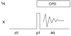 La séquence d'impulsions la plus simple utilisée pour les spectres 13C découplés du proton est représentée ci-dessous. Le découplage composite est appliqué en permanence tout au long de l'expérience, ce qui implique que l'effet Overhauser nucléaire sera rapidement maximum. On utilise également cette séquence pour bon nombre d'autres noyaux si l'on n'a pas besoin d'intégrer les pics du spectre.