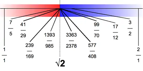 Cette coupure permet de représenter le nombre irrationnel √2 qui est ici défini à la fois par l'ensemble des nombres rationnels qui lui sont inférieurs et par celui des nombres rationnels qui lui sont supérieurs.
