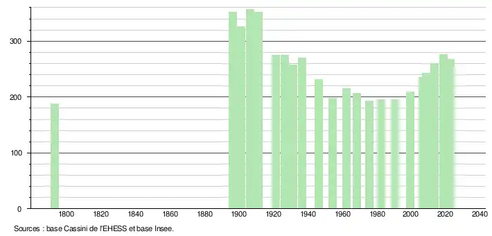 L'évolution du nombre d'habitants est connue à travers les recensements de la population effectués dans la commune depuis 1793. Pour les communes de moins de 10 000 habitants, une enquête de recensement portant sur toute la population est réalisée tous les cinq ans, les populations de référence des années intermédiaires étant quant à elles estimées par interpolation ou extrapolation[21]. Pour la commune, le premier recensement exhaustif entrant dans le cadre du nouveau dispositif a été réalisé en 2008[22].