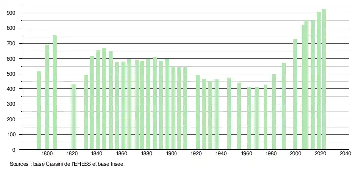 L'évolution du nombre d'habitants est connue à travers les recensements de la population effectués dans la commune depuis 1793. Pour les communes de moins de 10 000 habitants, une enquête de recensement portant sur toute la population est réalisée tous les cinq ans, les populations de référence des années intermédiaires étant quant à elles estimées par interpolation ou extrapolation[15]. Pour la commune, le premier recensement exhaustif entrant dans le cadre du nouveau dispositif a été réalisé en 2008[16].