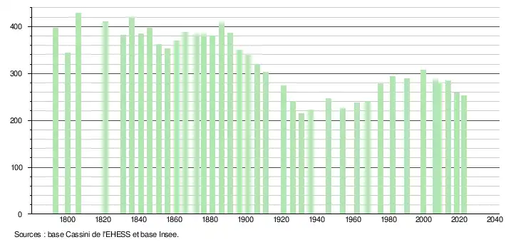 - ↑ Fiches Insee - Populations de référence de la commune pour les années 2006, 2007, 2008, 2009, 2010, 2011, 2012, 2013, 2014, 2015, 2016, 2017, 2018, 2019, 2020, 2021 et 2022.