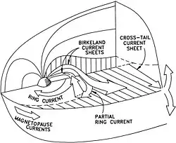 Le courant annulaire de la Terre est responsable du blindage des basses latitudes de la Terre à partir des champs électriques de la magnétosphère. Il a donc un effet important sur l'électrodynamique des tempêtes géomagnétiques. Le système du courant annulaire se compose d'une bande, à une distance de 3 à 5 RE[1], qui se trouve dans le plan équatorial et circule dans le sens des aiguilles d'une montre autour de la Terre (lorsque vu du nord). Les particules de cette région produisent un champ magnétique s'opposant à celui de la Terre et donc un observateur terrestre pourrait observer une diminution dans le champ magnétique dans cette zone.