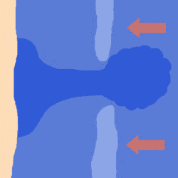 Si on considère deux vagues, la première passant sur un banc de sable (immergé ou non) et l'autre par un goulot entre deux bancs, la première se brisera au sommet du banc mais l'autre ne se brisera que plus loin sur la plage. Le niveau moyen de l'eau continuera donc de baisser dans le second secteur alors qu'il remontera dans le premier. Le ressac va donc naturellement s'écouler vers ce plus bas niveau[2],[3].