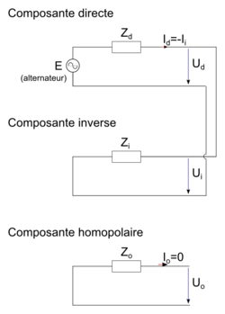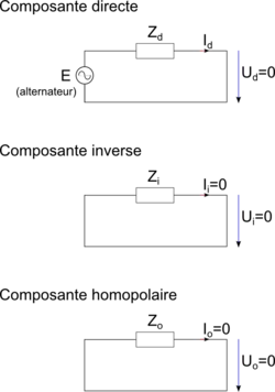 L'impédance directe et inverse de tous les composants électriques à l'exception des machines tournantes étant identiques, il est possible d'écrire On peut réécrire . En remplaçant E on obtient :