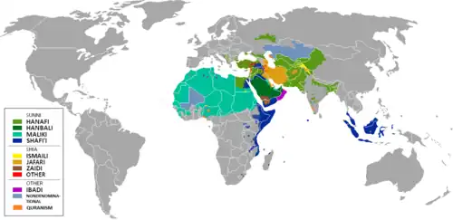 La branche sunnite (de sunna, « tradition »), majoritaire avec 87 à 90 % des musulmans (chiffres 2009)[4], se fonde sur l'usage des hadîths (les paroles et les actes de Mahomet), qu'elle adjoint au Coran pour la prise de décisions théologiques ou l'élaboration de lois. Selon le poids accordé aux sources et la manière d'établir la loi musulmane (ou charia), le sunnisme se subdivise à son tour en plusieurs écoles de système juridique islamique (droit musulman), dont les principales sont le hanafisme, le malikisme, le chaféisme et le hanbalisme, qui reconnaissent mutuellement leur validité. On relèvera aussi, dans le domaine de la philosophie et de la théologie, le mutazalisme et l'acharisme.