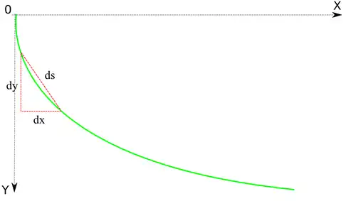 Soit l'équation cartésienne de la courbe (on exclut les courbes ayant des parties verticales), y étant dirigé vers le bas, et la courbe commençant à l'origine. On exprime un déplacement infinitésimal sur la courbe :