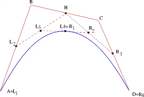 Plus précisément, on peut décomposer la courbe P(t) en deux courbes PL et PR dont les points de contrôles sont respectivement (L1, L2, L3, L4) et (R1, R2, R3, R4) avec