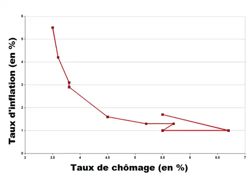 De ce fait, cette relation apparemment simple s'est retrouvée au centre de controverses touchant à des évolutions fondamentales de l'économie de la seconde moitié du XXe siècle, en particulier la question des politiques économiques et des anticipations. Au niveau empirique, la stagflation des années 1970 inflige un cruel démenti aux résultats antérieurs et confirme l'analyse monétariste : chômage élevé et forte inflation paraissent être deux phénomènes qui peuvent coexister pendant une période assez longue[2].
