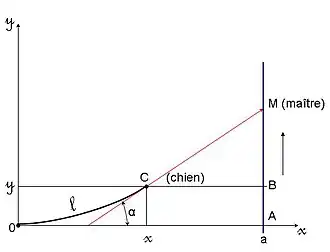 Il s’agit d’établir l'équation de la trajectoire que parcourt un chien lorsque son maître, éloigné, l'appelle tout en se déplaçant sur une droite perpendiculairement au segment de droite les séparant à l’instant origine. On conviendra qu'à cet instant, le maître est à une distance du chien ; il se déplace de façon uniforme à la vitesse . Le chien accourt à une vitesse et de façon à être, à tout moment, dirigé vers son maître. On peut donc choisir un repère orthonormé, tel que le chien soit au point O de coordonnées (0,0) et le maître au point A de coordonnées (a,0) au départ, la droite décrite par le maître étant celle d’équation . On désigne par les coordonnées du chien au bout du temps .