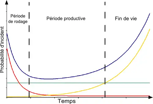 - une courbe des incidents liés au rodage du système, qui commence à un niveau élevé puis décroit avec le temps ;