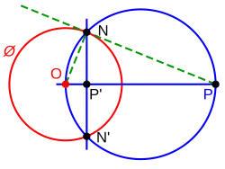 Pour construire le point inverse P' d'un point P par rapport à un cercle C de centre O et de rayon r, si le point est extérieur au cercle, on trace la tangente à C passant par P, puis on projette orthogonalement le point de tangence N sur la droite (OM). Ce point projeté est l'image de A' par inversion : en effet, on a, par similarité des triangles rectangles P'ON et NOP, l'égalité OP'×OP = P'N2.